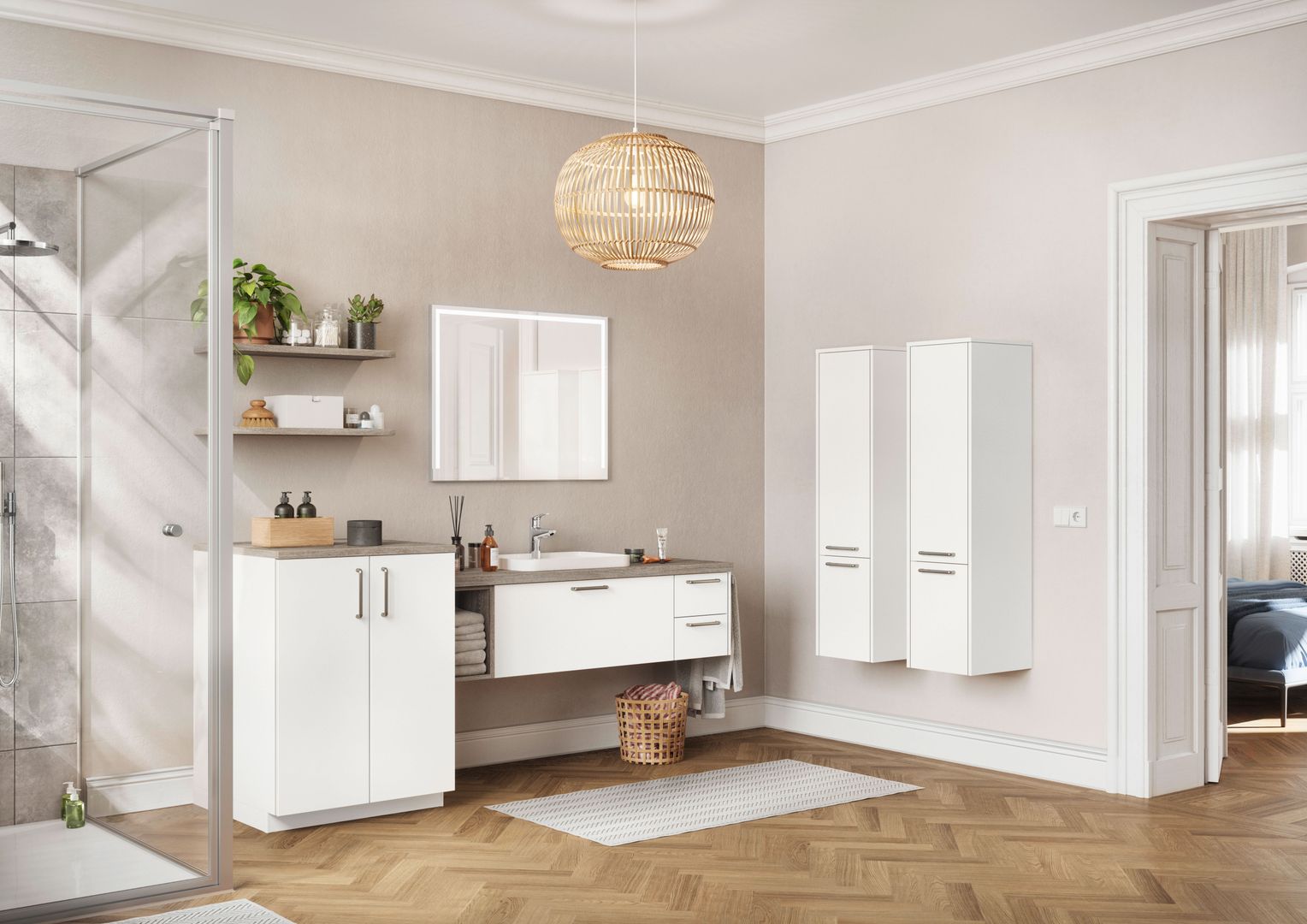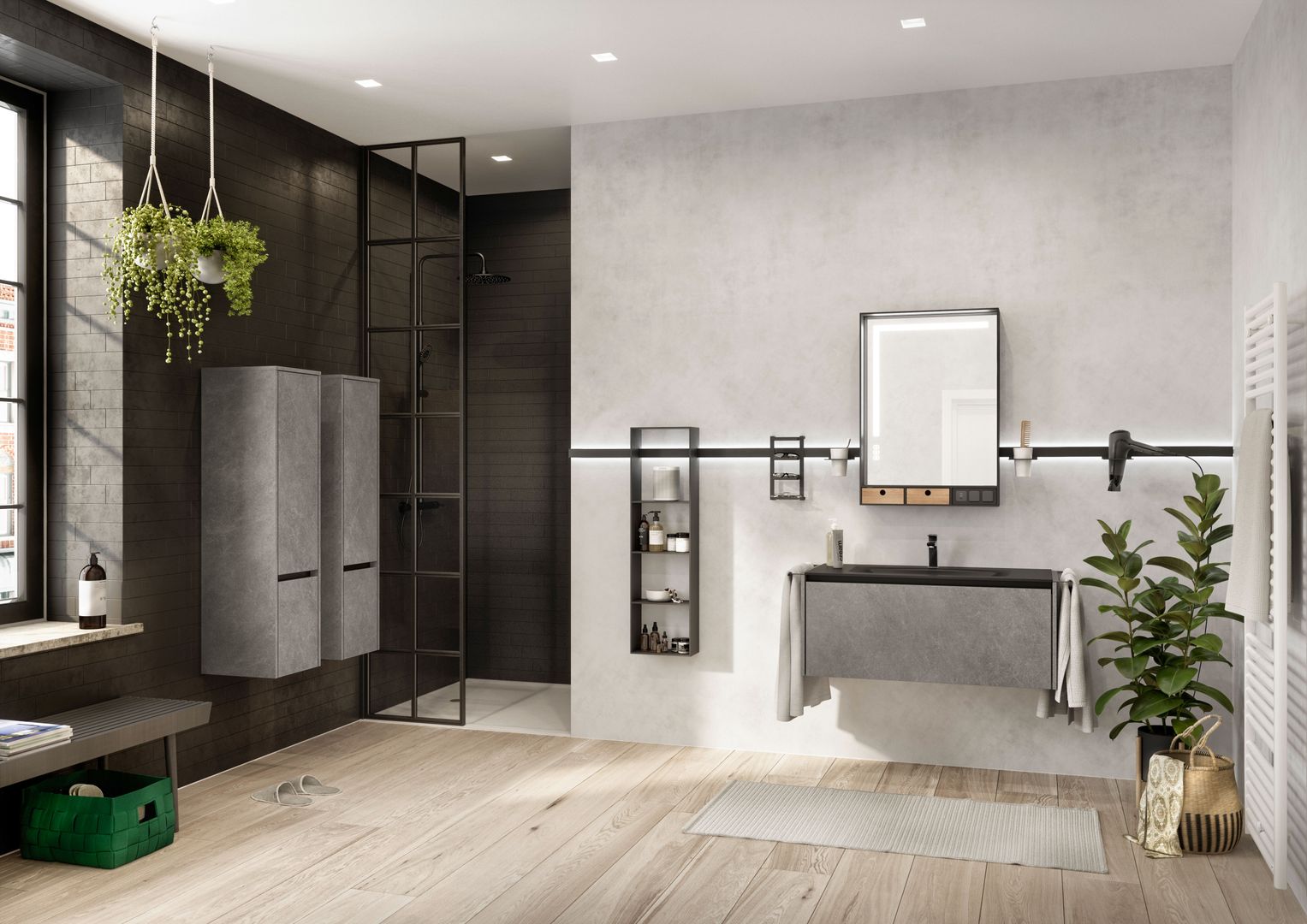 Das Badezimmerlicht sollte nach Möglichkeit freundlich sein. Denn wenn einen das eigene Spiegelbild nicht nur unausgeschlafen, sondern auch bis ins letzte Detail ausgeleuchtet am Morgen begrüßt, dreht man am liebsten gleich wieder um. Für einen guten Start in den Tag ist daher eine ausgewogene und stimmungsvolle Beleuchtung vorteilhaft. Sie sorgt außerdem für ein freundliches Wohlfühlambiente und ideale Lichtverhältnisse. Eine extra Wandlampe oder eine dimmbare Spiegelleuchte machen da bereits einen großen Unterschied.